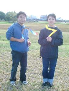 ブーメランに輪ゴムや硬貨をつけて重りにしたりして苦心の末の練習会となりました。